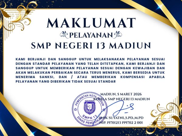 Kenyamanan Anda adalah prioritas utama kami. Melalui Maklumat Pelayanan ini, kami ingin menegaskan komitmen SMP Negeri 13 Madiun dalam memberikan..